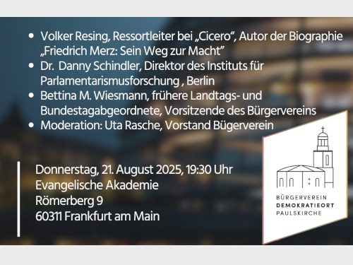 In the series "Reflecting on Democracy", the citizens' association Demokratieort Paulskirche e.V. will address the question: What kind of personnel for our democracy? In the panel discussion, Danny Schindler will debate this with Volker Rissing (Head of the "Berliner Republik" department of Cicero magazine) and Bettina M. Wiesmann (former Member of the Bundestag and Member of the State Parliament in Hesse).