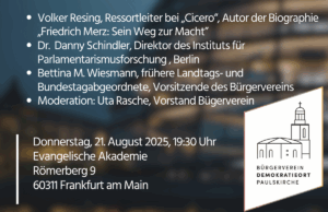 In der Reihe „Nachdenken über Demokratie“ widmet sich der Bürgerverein Demokratieort Paulskirche e.V. am 21. August in der Evangelischen Akademie am Römerberg (Frankfurt am Main) der Frage: Welches Personal für unsere Demokratie? In der Podiumsdiskussion debattiert Danny Schindler dazu mit Volker Rissing (Ressortleiter „Berliner Republik” des Magazins Cicero) und Bettina M. Wiesmann (ehem. MdB und MdL in Hessen).